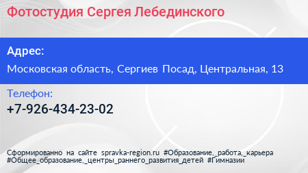 Фотостудия Сергея Лебединского по адресу Московская область, Сергиев Посад, Центральная, 13 в дальнейшем Организация, размещена в следующих категориях:
