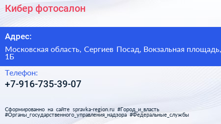 Кибер, фотосалон по адресу Московская область, Сергиев Посад, Вокзальная площадь, 1Б в дальнейшем Организация, размещена в следующих категориях: