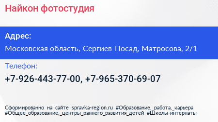 Найкон, фотостудия по адресу Московская область, Сергиев Посад, Матросова, 2/1 в дальнейшем Организация, размещена в следующих категориях: