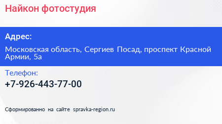 Найкон, фотостудия по адресу Московская область, Сергиев Посад, проспект Красной Армии, 5а в дальнейшем Организация, размещена в следующих категориях:
