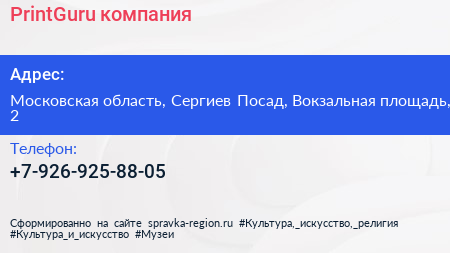 PrintGuru, компания по адресу Московская область, Сергиев Посад, Вокзальная площадь, 2 в дальнейшем Организация, размещена в следующих категориях: