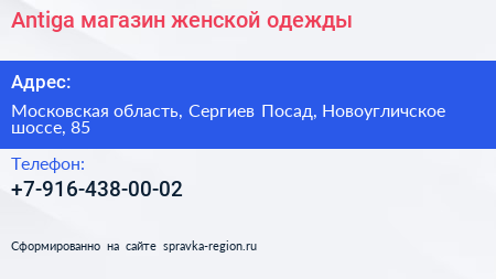 Antiga, магазин женской одежды по адресу Московская область, Сергиев Посад, Новоугличское шоссе, 85 в дальнейшем Организация, размещена в следующих категориях: