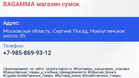 BAGAMMA, магазин сумок по адресу Московская область, Сергиев Посад, Новоугличское шоссе, 85 в дальнейшем Организация, размещена в следующих категориях: