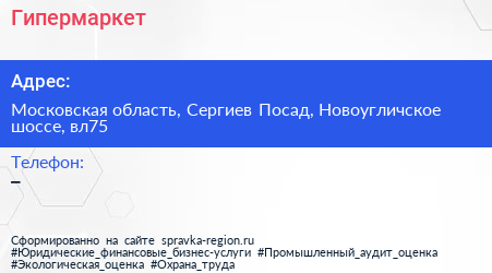Гипермаркет по адресу Московская область, Сергиев Посад, Новоугличское шоссе, вл75 в дальнейшем Организация, размещена в следующих категориях:
