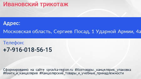 Ивановский трикотаж по адресу Московская область, Сергиев Посад, 1 Ударной Армии, 4а в дальнейшем Организация, размещена в следующих категориях: