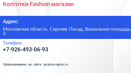 Колготки Fashion, магазин по адресу Московская область, Сергиев Посад, Вокзальная площадь, 2 в дальнейшем Организация, размещена в следующих категориях: