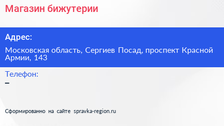 Магазин бижутерии по адресу Московская область, Сергиев Посад, проспект Красной Армии, 143 в дальнейшем Организация, размещена в следующих категориях: