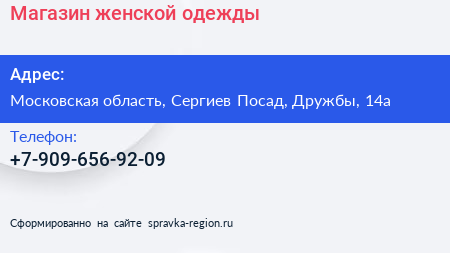 Магазин женской одежды по адресу Московская область, Сергиев Посад, Дружбы, 14а в дальнейшем Организация, размещена в следующих категориях: