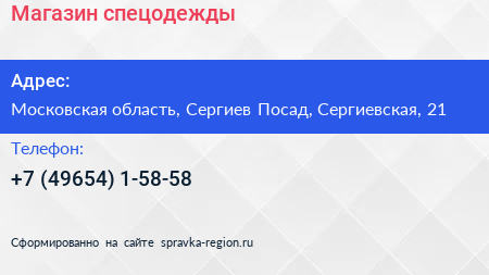 Магазин спецодежды по адресу Московская область, Сергиев Посад, Сергиевская, 21 в дальнейшем Организация, размещена в следующих категориях: