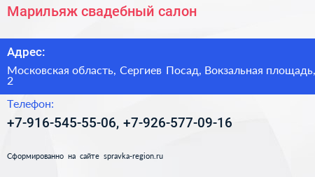 Марильяж, свадебный салон по адресу Московская область, Сергиев Посад, Вокзальная площадь, 2 в дальнейшем Организация, размещена в следующих категориях:
