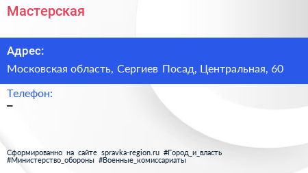 Мастерская по адресу Московская область, Сергиев Посад, Центральная, 60 в дальнейшем Организация, размещена в следующих категориях: