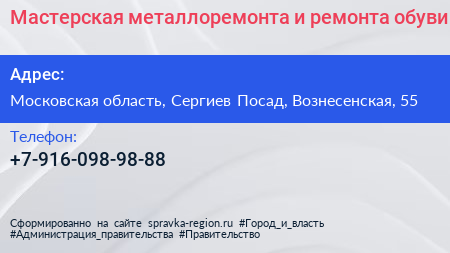 Мастерская металлоремонта и ремонта обуви по адресу Московская область, Сергиев Посад, Вознесенская, 55 в дальнейшем Организация, размещена в следующих категориях: