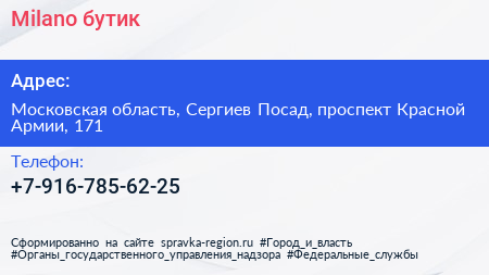 Milano, бутик по адресу Московская область, Сергиев Посад, проспект Красной Армии, 171 в дальнейшем Организация, размещена в следующих категориях:
