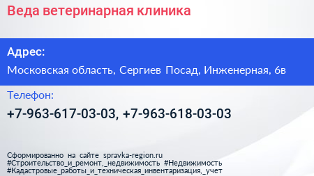 Веда, ветеринарная клиника по адресу Московская область, Сергиев Посад, Инженерная, 6в в дальнейшем Организация, размещена в следующих категориях: