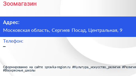 Зоомагазин по адресу Московская область, Сергиев Посад, Центральная, 9 в дальнейшем Организация, размещена в следующих категориях: