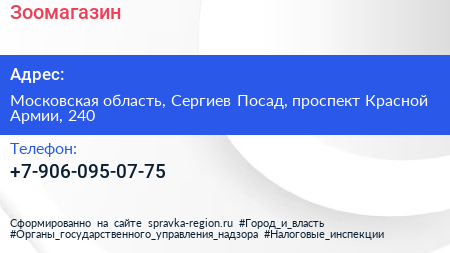 Зоомагазин по адресу Московская область, Сергиев Посад, проспект Красной Армии, 240 в дальнейшем Организация, размещена в следующих категориях: