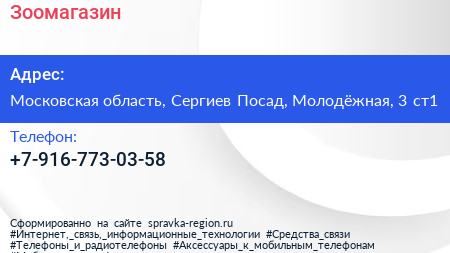 Зоомагазин по адресу Московская область, Сергиев Посад, Молодёжная, 3 ст1 в дальнейшем Организация, размещена в следующих категориях: