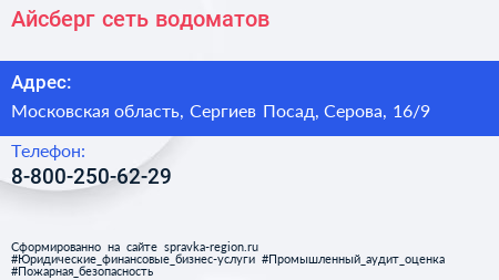 Айсберг, сеть водоматов по адресу Московская область, Сергиев Посад, Серова, 16/9 в дальнейшем Организация, размещена в следующих категориях: