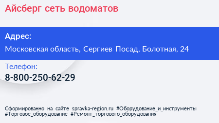 Айсберг, сеть водоматов по адресу Московская область, Сергиев Посад, Болотная, 24 в дальнейшем Организация, размещена в следующих категориях: