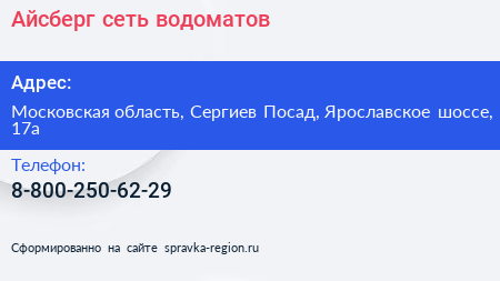 Айсберг, сеть водоматов по адресу Московская область, Сергиев Посад, Ярославское шоссе, 17а в дальнейшем Организация, размещена в следующих категориях: