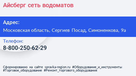 Айсберг, сеть водоматов по адресу Московская область, Сергиев Посад, Симоненкова, 9а в дальнейшем Организация, размещена в следующих категориях: