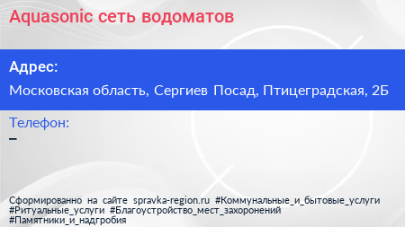 Aquasonic, сеть водоматов по адресу Московская область, Сергиев Посад, Птицеградская, 2Б в дальнейшем Организация, размещена в следующих категориях: