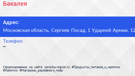 Бакалея по адресу Московская область, Сергиев Посад, 1 Ударной Армии, 12 в дальнейшем Организация, размещена в следующих категориях: