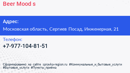 Beer Mood`s по адресу Московская область, Сергиев Посад, Инженерная, 21 в дальнейшем Организация, размещена в следующих категориях: