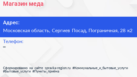 Магазин меда по адресу Московская область, Сергиев Посад, Пограничная, 28 к2 в дальнейшем Организация, размещена в следующих категориях: