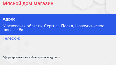 Мясной дом, магазин по адресу Московская область, Сергиев Посад, Новоугличское шоссе, 48а в дальнейшем Организация, размещена в следующих категориях: