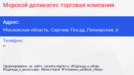 Морской деликатес, торговая компания по адресу Московская область, Сергиев Посад, Пионерская, 6 в дальнейшем Организация, размещена в следующих категориях: