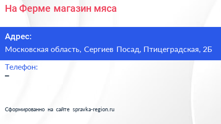 На Ферме, магазин мяса по адресу Московская область, Сергиев Посад, Птицеградская, 2Б в дальнейшем Организация, размещена в следующих категориях: