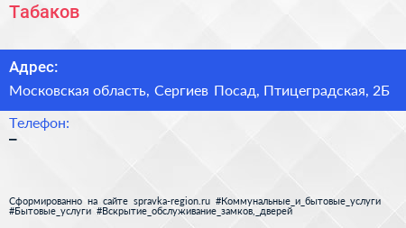 Табаков по адресу Московская область, Сергиев Посад, Птицеградская, 2Б в дальнейшем Организация, размещена в следующих категориях: