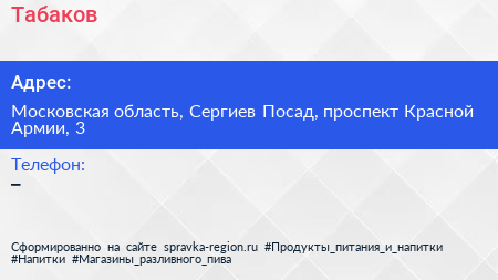 Табаков по адресу Московская область, Сергиев Посад, проспект Красной Армии, 3 в дальнейшем Организация, размещена в следующих категориях: