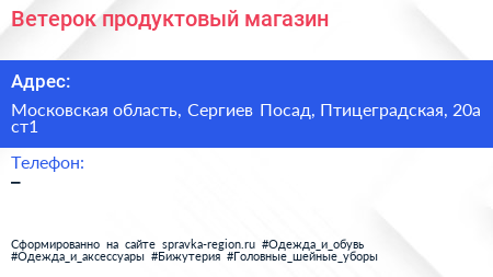 Ветерок, продуктовый магазин по адресу Московская область, Сергиев Посад, Птицеградская, 20а ст1 в дальнейшем Организация, размещена в следующих категориях: