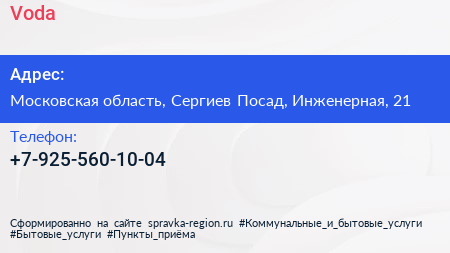 Voda+ по адресу Московская область, Сергиев Посад, Инженерная, 21 в дальнейшем Организация, размещена в следующих категориях: