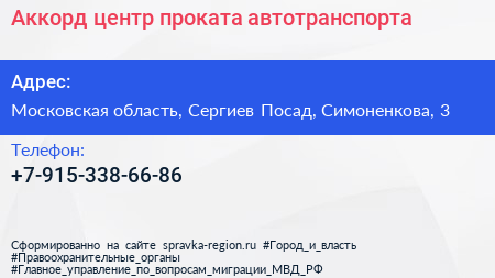 Аккорд, центр проката автотранспорта по адресу Московская область, Сергиев Посад, Симоненкова, 3 в дальнейшем Организация, размещена в следующих категориях: