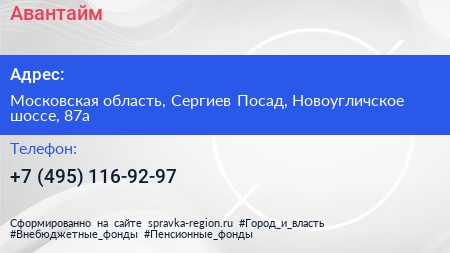 Авантайм по адресу Московская область, Сергиев Посад, Новоугличское шоссе, 87а в дальнейшем Организация, размещена в следующих категориях: