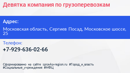 Девятка, компания по грузоперевозкам по адресу Московская область, Сергиев Посад, Московское шоссе, 25 в дальнейшем Организация, размещена в следующих категориях: