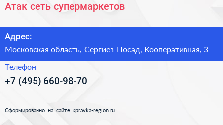 Атак, сеть супермаркетов по адресу Московская область, Сергиев Посад, Кооперативная, 3 в дальнейшем Организация, размещена в следующих категориях: