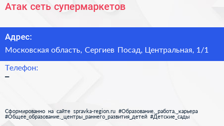 Атак, сеть супермаркетов по адресу Московская область, Сергиев Посад, Центральная, 1/1 в дальнейшем Организация, размещена в следующих категориях: