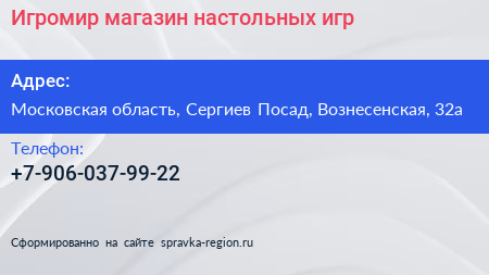 Игромир, магазин настольных игр по адресу Московская область, Сергиев Посад, Вознесенская, 32а в дальнейшем Организация, размещена в следующих категориях: