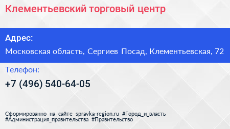 Клементьевский, торговый центр по адресу Московская область, Сергиев Посад, Клементьевская, 72 в дальнейшем Организация, размещена в следующих категориях: