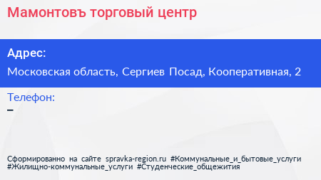 Мамонтовъ, торговый центр по адресу Московская область, Сергиев Посад, Кооперативная, 2 в дальнейшем Организация, размещена в следующих категориях: