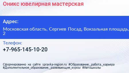 Оникс, ювелирная мастерская по адресу Московская область, Сергиев Посад, Вокзальная площадь, 2 в дальнейшем Организация, размещена в следующих категориях: