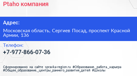 Ptaho, компания по адресу Московская область, Сергиев Посад, проспект Красной Армии, 136 в дальнейшем Организация, размещена в следующих категориях:
