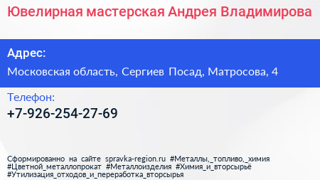 Ювелирная мастерская Андрея Владимирова по адресу Московская область, Сергиев Посад, Матросова, 4 в дальнейшем Организация, размещена в следующих категориях: