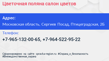 Цветочная поляна, салон цветов по адресу Московская область, Сергиев Посад, Птицеградская, 2Б в дальнейшем Организация, размещена в следующих категориях: