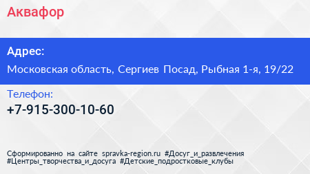 Аквафор по адресу Московская область, Сергиев Посад, Рыбная 1-я, 19/22 в дальнейшем Организация, размещена в следующих категориях: