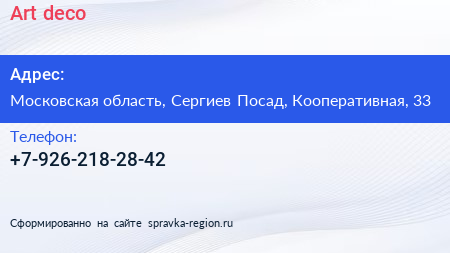 Art deco по адресу Московская область, Сергиев Посад, Кооперативная, 33 в дальнейшем Организация, размещена в следующих категориях: